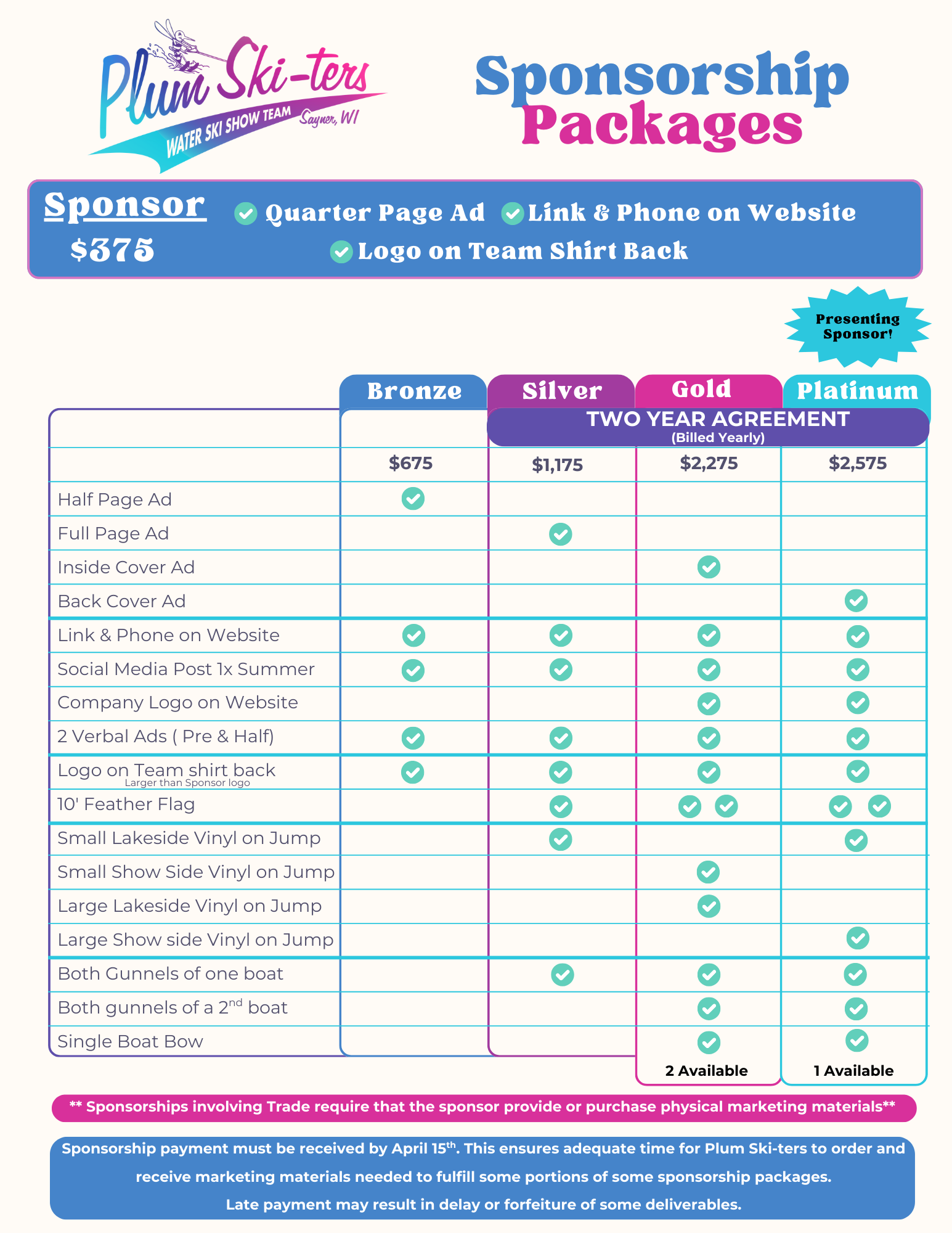 Our pre-grouped sponsorship packages provide the most bang for your marketing budget. If you have other requests that would best market your specific business, contact marketing@plumskiters.org to discuss options for a custom sponsor package.